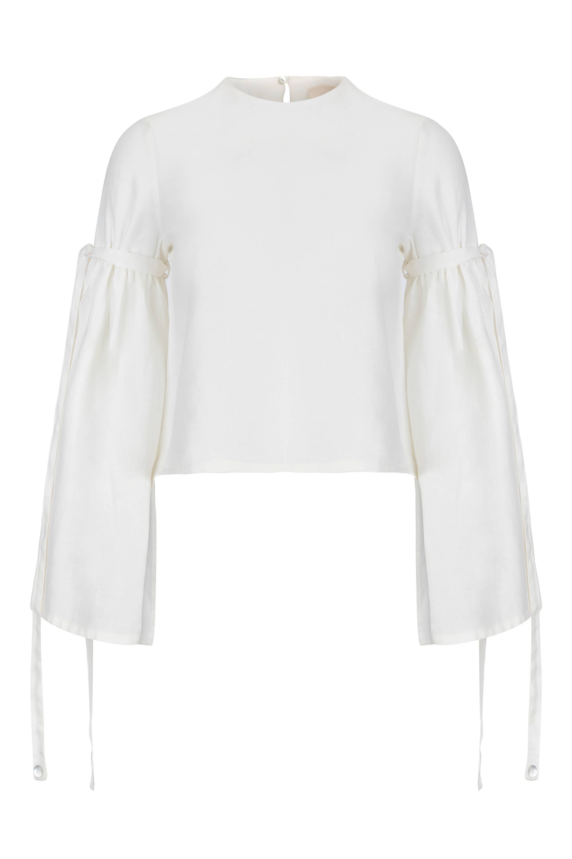 100% Linen, cropped top with long flounced sleeves with tie.