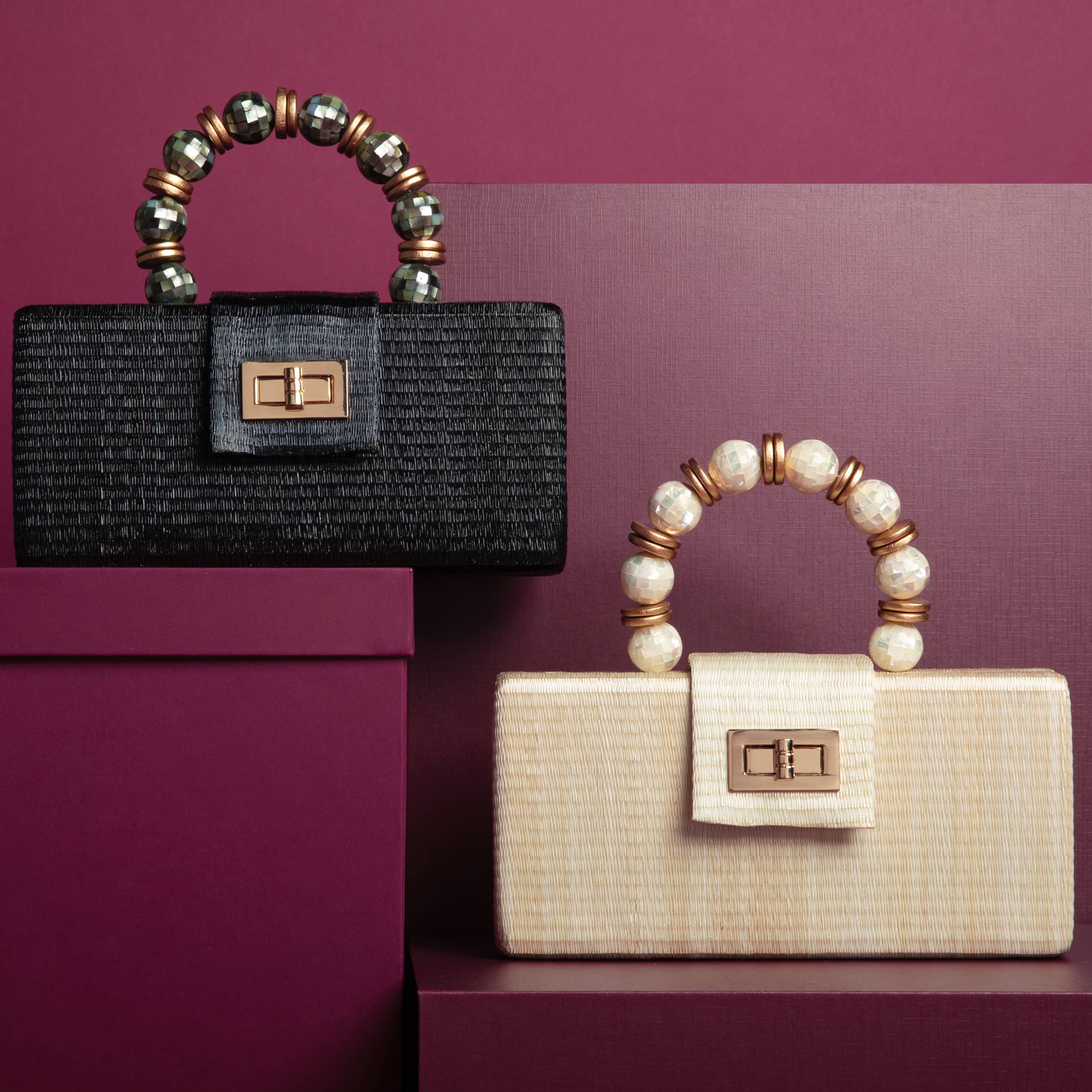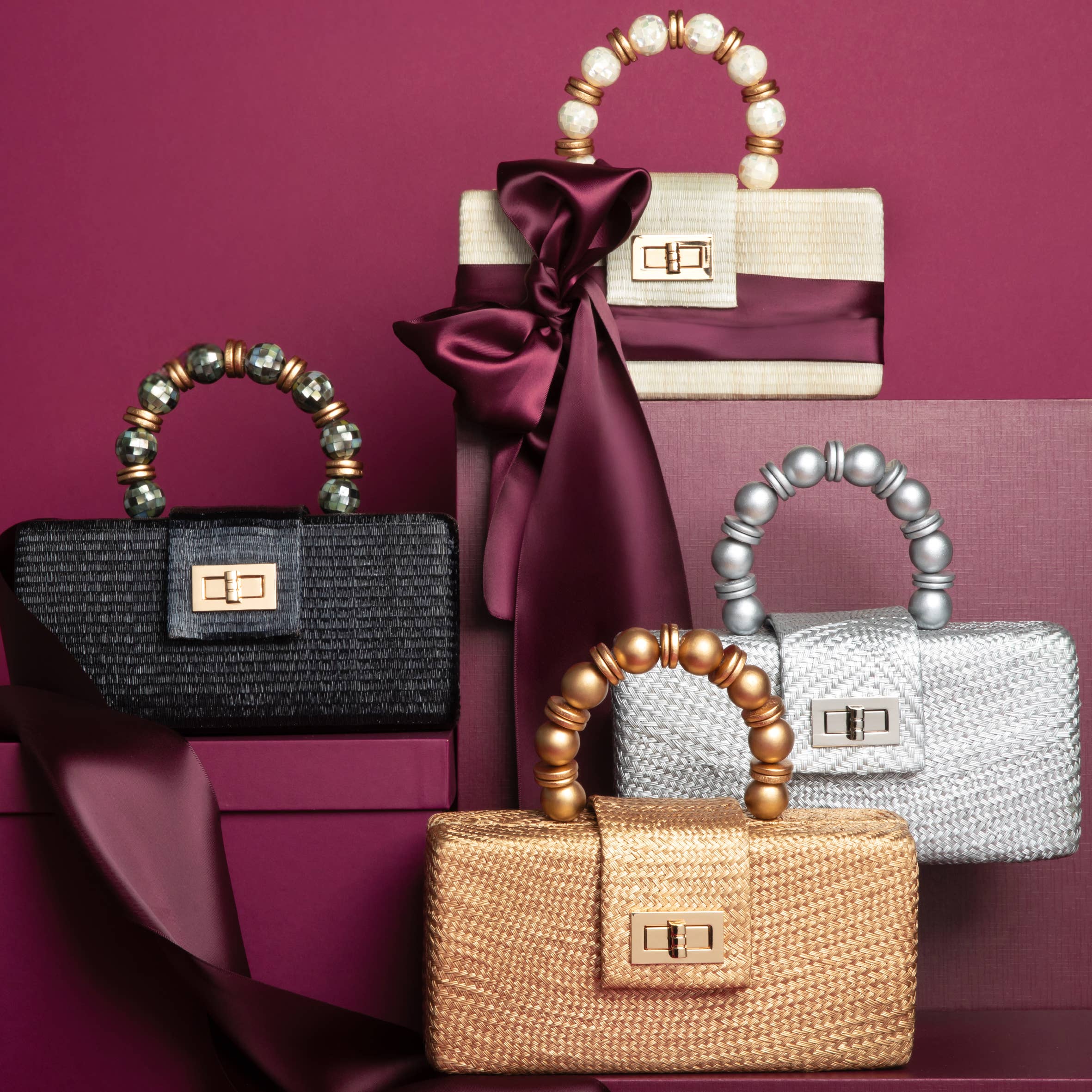 Handcrafted by skilled artisans, this luxury resort accessory showcases the intricate beauty of traditional buntal straw weaving in a classic black that makes the perfect holiday party clutch. The show-stopping handle features individually handmade grey shell inlay beads paired with gleaming gold wooden rondelle accents, creating a striking contrast that elevates this black Christmas purse beyond ordinary evening bags.