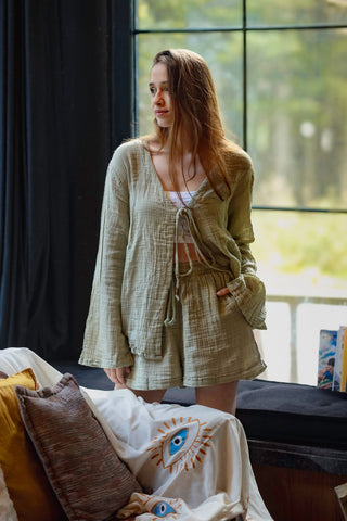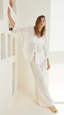 This modern voyage set brings a burst of energy for body, mind and style. 100% textured cotton cues calm and coastal while light texture brings freshness to your hot summer days. The Sheer Cotton makes you feel irresistibly comfy and comes with a voyage Pant. How to wear it: Complete the Voyage set look with Aria top inside!