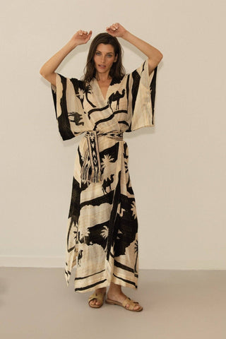 Make a memorable statement by the sea or in the lounge with the hand loomed Ava kimono. An asymmetric frayed hem along with side slits, add movement and flow to a roomy drape.