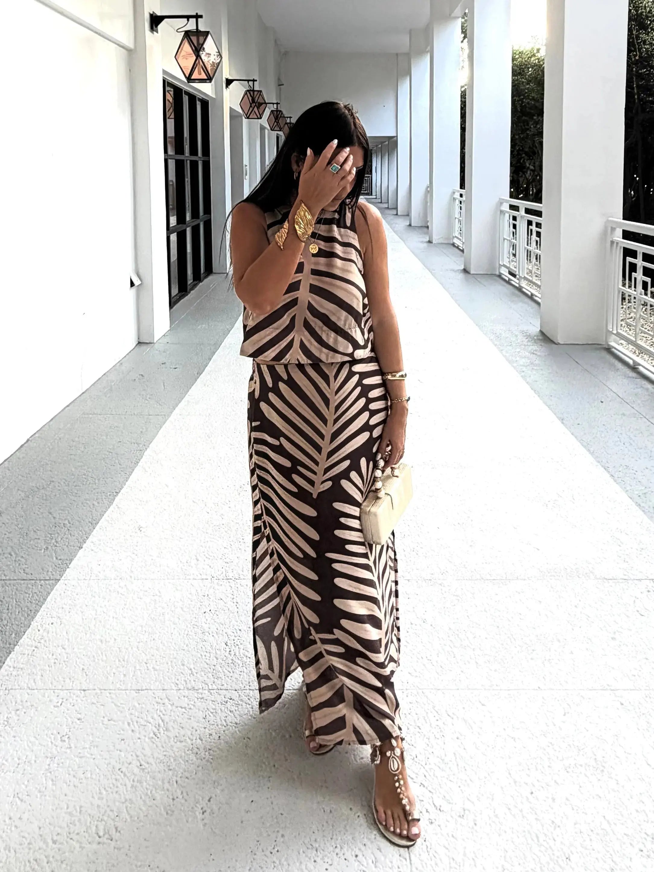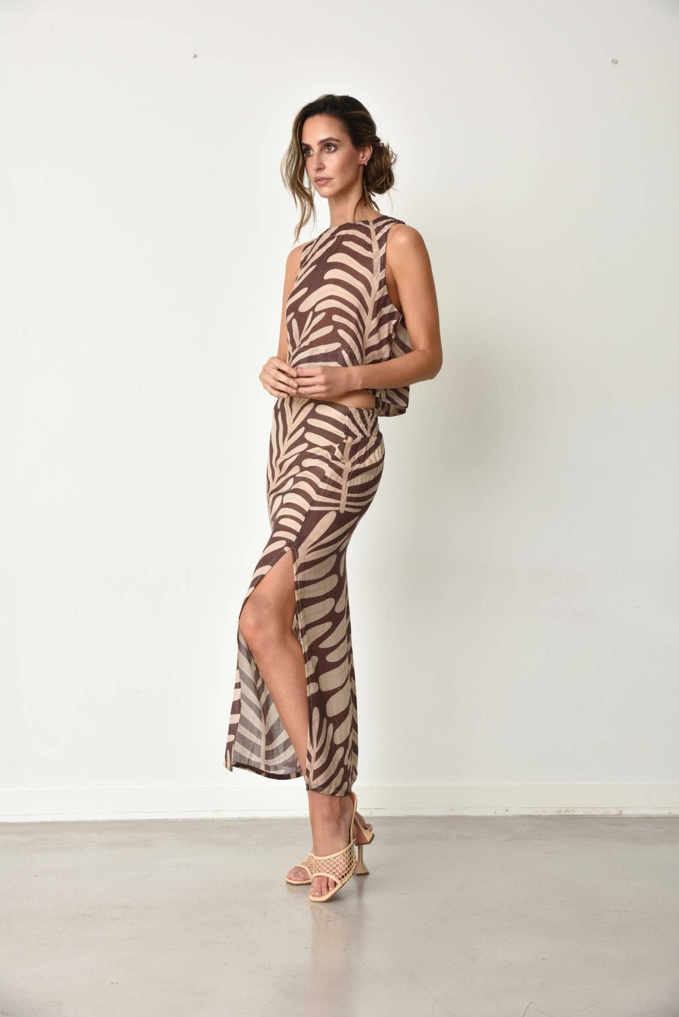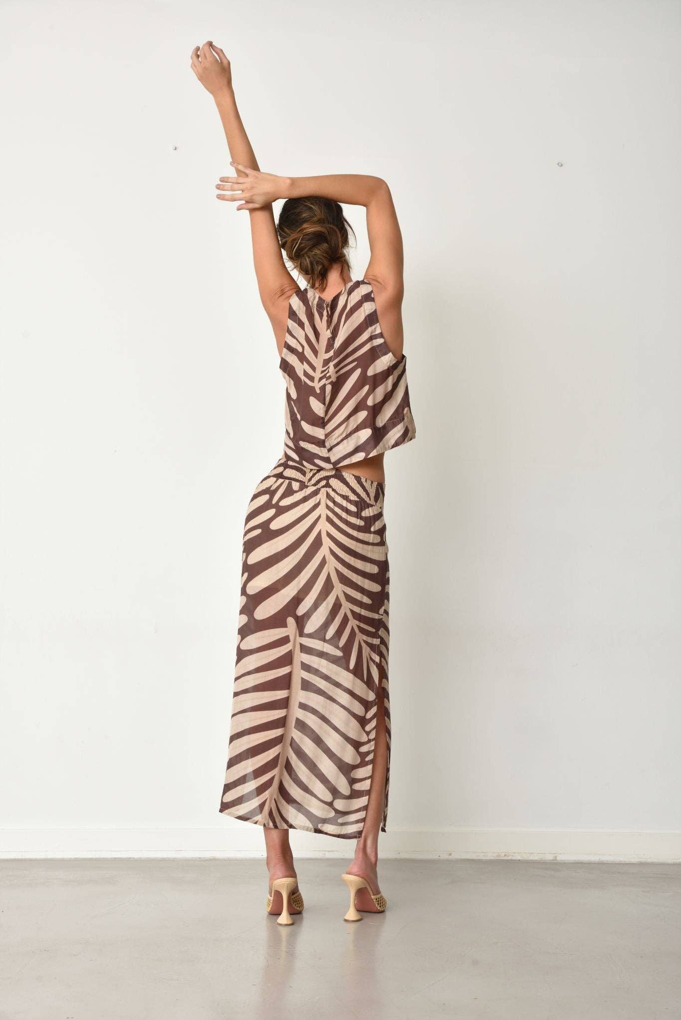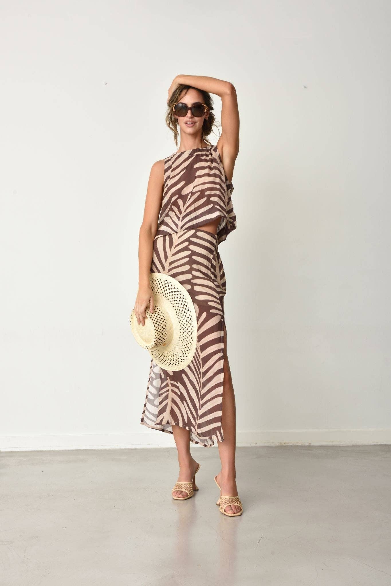 Indulge your daring personality with the Vivi top, featuring a mocha mousse and natural smooth print. This unique garment effortlessly combines romance and adventure, making it a coveted addition to your wardrobe. Complete your boho chic look by pairing it with the matching skirt. Don't hesitate to add this captivating and alluring top to your collection.